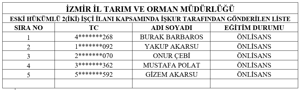İl Müdürlüğümüzde görev yapmak üzere; 4857 sayılı İş Kanunu'nun 30. maddesi gereğince, Kamu Kurum ve Kuruluşlarına Eski Hükümlü veya Terörle Mücadelede Malul Sayılmayacak Şekilde Yararlananların İşçi Olarak Alınmasında Uygulanacak Usul ve Esaslar Hakkında Yönetmelik hükümleri çerçevesinde Türkiye İş Kurumu (İŞKUR) aracılığıyla Daimi İşçi statüsünde çalıştırılmak üzere alınacak Tarım İşçisi 2(iki) adet eski hükümlü işçi alımı için başvuru evrakları İl Müdürlüğümüze 06.01.2025-10.01.2025 tarihleri arasında elden teslim edilecek olup,